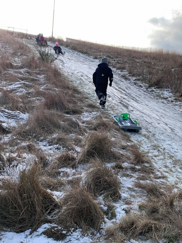 Fredag eftenmiddag var det som at få et déjà vu, når man som voksen kom forbi Djævlebakken, som var en af flere med det navn i Hirtshals. Her var Baktora, Mischa, Angilin og Kristin i fuld gang med at kælke på den berømte bakke på Nejst. Der var ikke meget sne, men nok til at de fire glade børn fik fart på ned ad bakken.