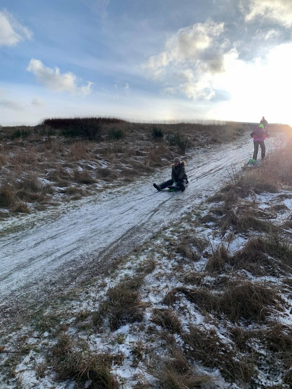 Fredag eftenmiddag var det som at få et déjà vu, når man som voksen kom forbi Djævlebakken, som var en af flere med det navn i Hirtshals. Her var Baktora, Mischa, Angilin og Kristin i fuld gang med at kælke på den berømte bakke på Nejst. Der var ikke meget sne, men nok til at de fire glade børn fik fart på ned ad bakken.