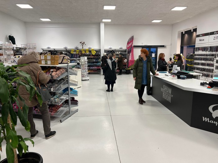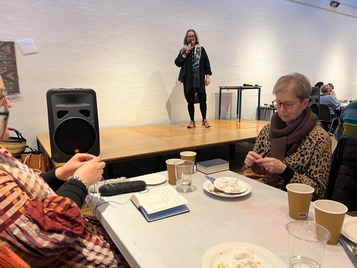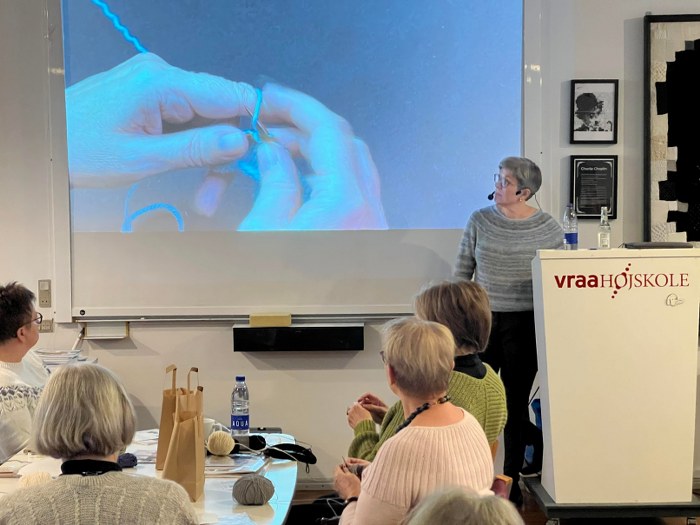 Derefter skulle vi selv i gang med at lave indtagninger og udtagninger på en anderledes måde. En sjov og super fin workshop. Derefter tilbage i den store sal, hvor kaffe og lækker snack og boller ventede én. Så kom Signe, som er højskolelærer på stedet, for igen at synge med den store forsamling. Vi sang blandt andet en af Alberte Vindings nye sange i Højskolesangbogen. Så blev en del tilbage og hørte oplæsning, mens de andre tog med skolens bus en tur til Mayflower i Brønderslev, hvor man kunne købe lækkert garn. Og her blev der virkelig handlet.