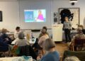 Anne Friis fortalte så om dagens program. De fremmødte blev delt i to hold i forhold til workshop. Dorthe Nielsen var den første oplægsholder, som kom fra Mayflower. Hun fortalte, hvordan hun kom ind i firmaet Mayflower og om sin egen strikkehistorie. Derefter fortalte hun om de forskellige garntyper, samtidig med at alle fik mulighed for at røre de forskellige garntyper. Et flot og meget informerende foredrag.