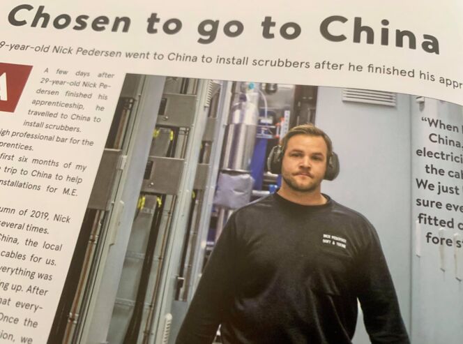 Denne gang er Nick Pedersen så havnet i Søfarts store engelsksprogede magasin MARITIME. Magasinet har nemlig spottet, hvilken fart den unge mand har på karrieren, der blandt andet i foråret og efteråret 2019 har bragt ham til Kina for at installere såkaldte scrubbers for M. E. Productions.