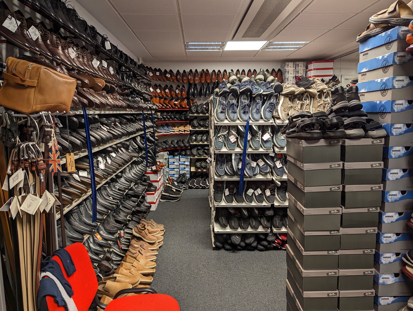 Da der skal være sko til alle, er der damesko fra størrelse 35 – 45 og herresko i størrelsen 39 – 51. Der er selvfølgelig også et stort udvalg i sko til både piger og drenge. Af andre varegrupper kan nævnes sandaler, støvler, gummistøvler, paraplyer, kufferter, rensesæt og imprægnering til sko og lædervarer, snørebånd, såler, ja, der er så meget, at det er umuligt at beskrive. Det skal ses i butikken.