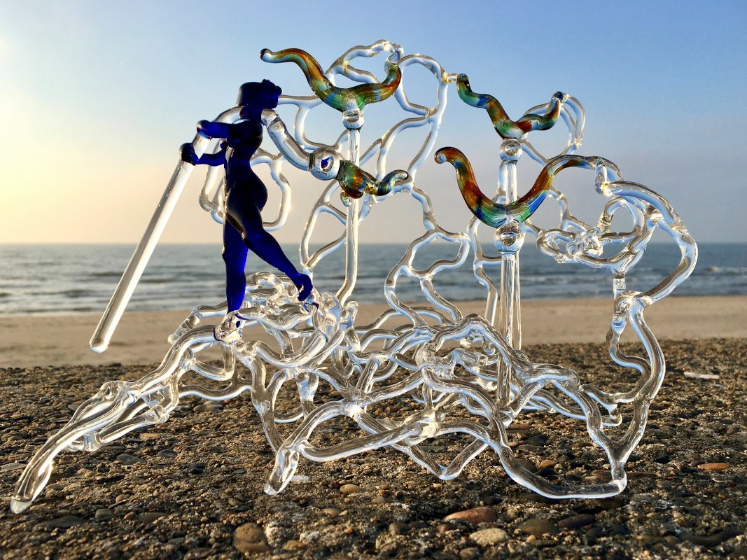 Jeg arbejder også rent skulpturelt med glasset som flameworker, en proces hvor jeg smelter glasset i en 1.000 grader varm flamme, mens jeg former og skulpturerer glasmassen.