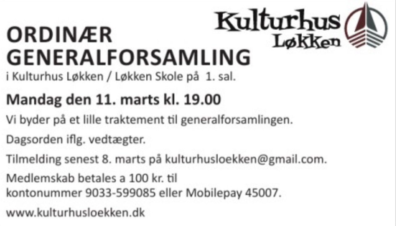 Der afholdes Ordinær Generalforsamling i Kulturhus Løkken Mandag den 11. marts 2024.