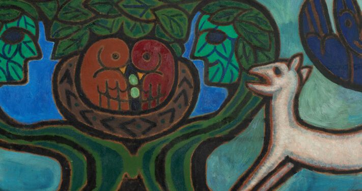Motivet er et genoptryk af maleriet ‘Fugl i rede – hvid kat’ med tilladelse fra Heerup Museum.