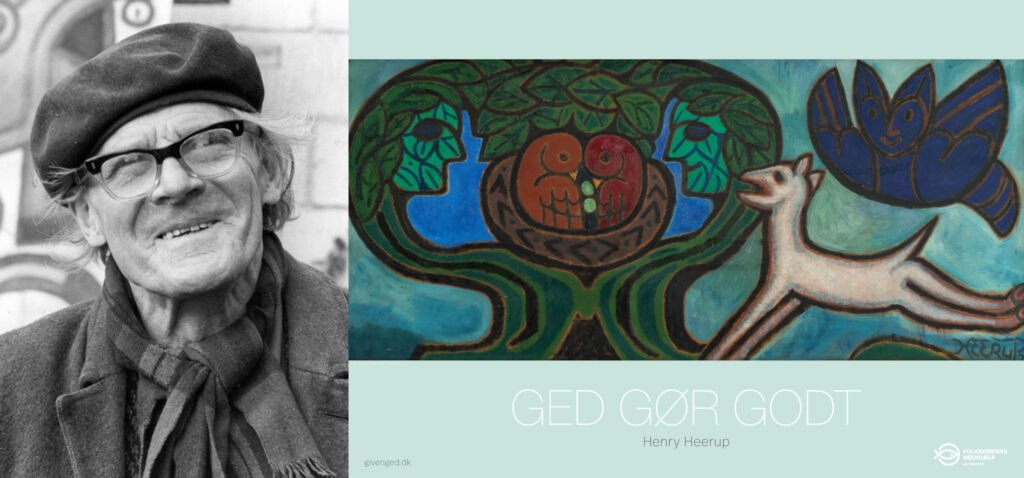 ”Kunstneren Henry Heerups karakteristiske og indbydende streg og motiviske udtryk findes på en lang række plakater, stickers, T-shirts, poser og meget andet i forbindelse med velgørenhed, som han synes, var vigtige at støtte op om. Sammen med en række af hans samtidige kolleger var Heerup optaget af at få kunsten ud til mange – både i form af udstillinger på arbejdspladser og ved at bruge kunsten til at fremme gode formål.”