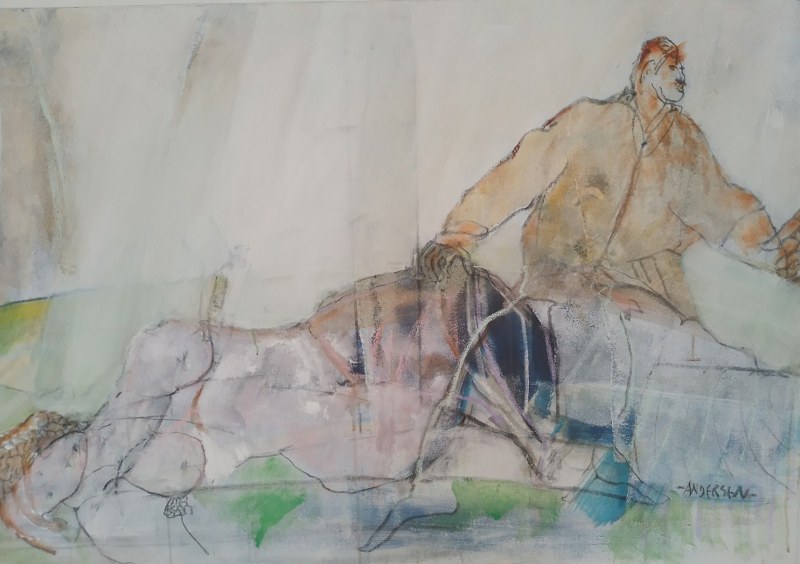 – Mogens Andersen er udannet oboist på musikkonservatoriet og har undervist i musik og kunst på Vrå Højskele. I 1990’erne tog mod til sig og blev heltidsmaler. Og det valg har han stået ved lige siden. Han har tidligere været tilknyttet Galleri Rasmus, og siden 2018 har han haft private udstillinger og drevet sit eget galleri. Hans motiver kredser ofte om kvinder og dyr – men det er ikke zoologi, det er poesi. Der er noget både drømmende og jordnært i hans billeder – som om han har fanget en stemning, før den forsvandt ud ad døren.