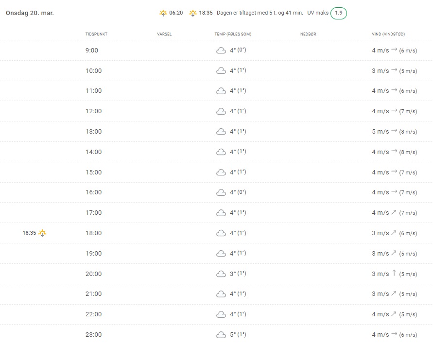 Temperaturer op mellem 7 og 12 graders varme og svag til jævn vind fra skiftende retninger. I aften og i nat skyet og i den sydvestligste del regn, som i løbet af natten breder sig til hele landet.