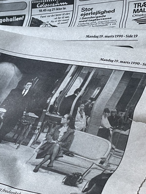 Broderierne var rullet op på en avis (Frederikshavns Avis) fra 19. marts 1990. Næppe tilfældigt valg, for inde i bladet var en lille artikel om bysbarnet, designeren Erik Mortensen, som jeg mødte ved flere lejligheder. Billedet er fra et besøg på hans arbejdsplads, “Ballmain” i Paris, et sted fyldt med kontraster og kvinder, der mestrede kunsten at sy, når Mortensen havde tegnet.