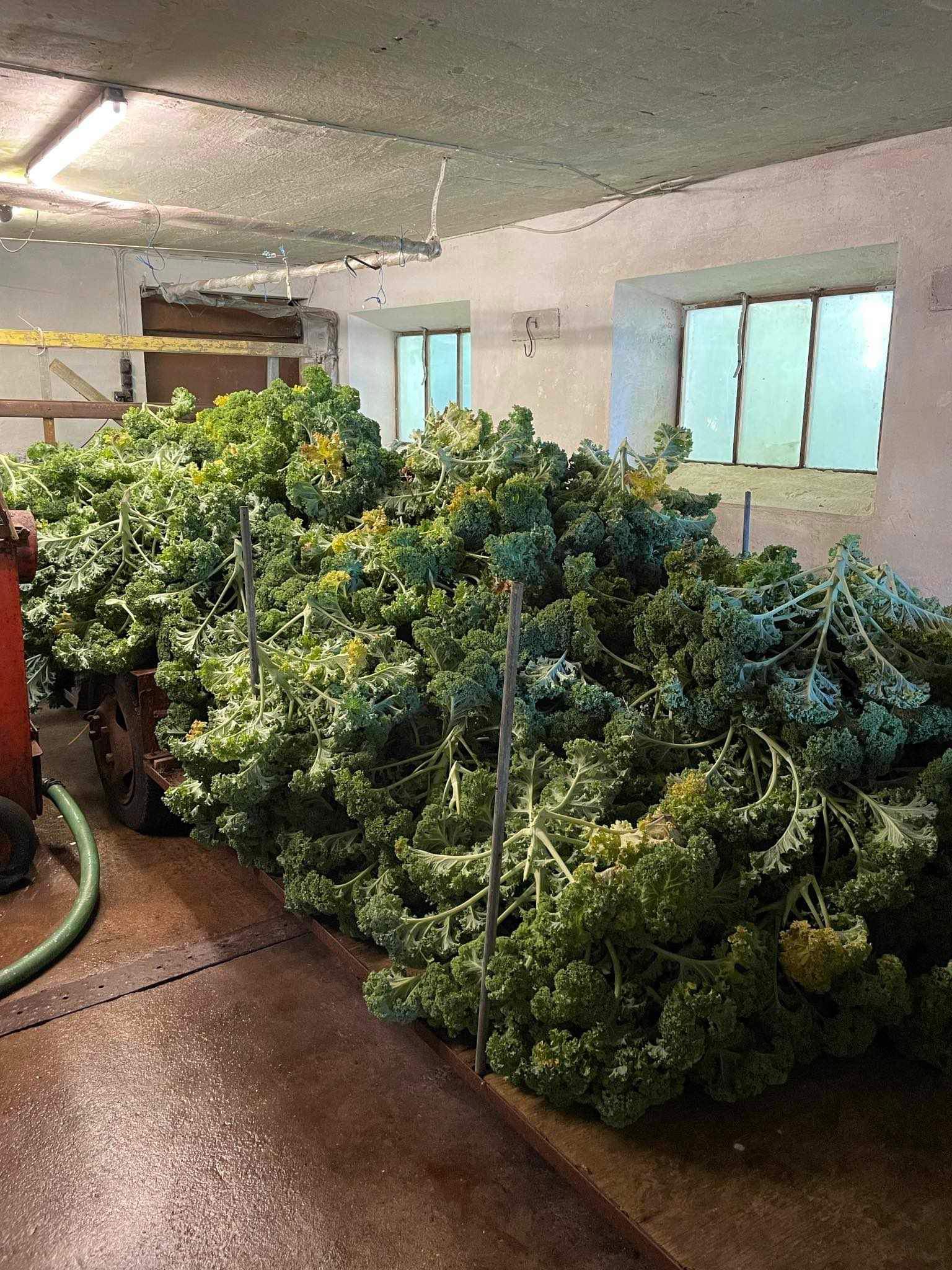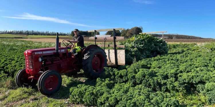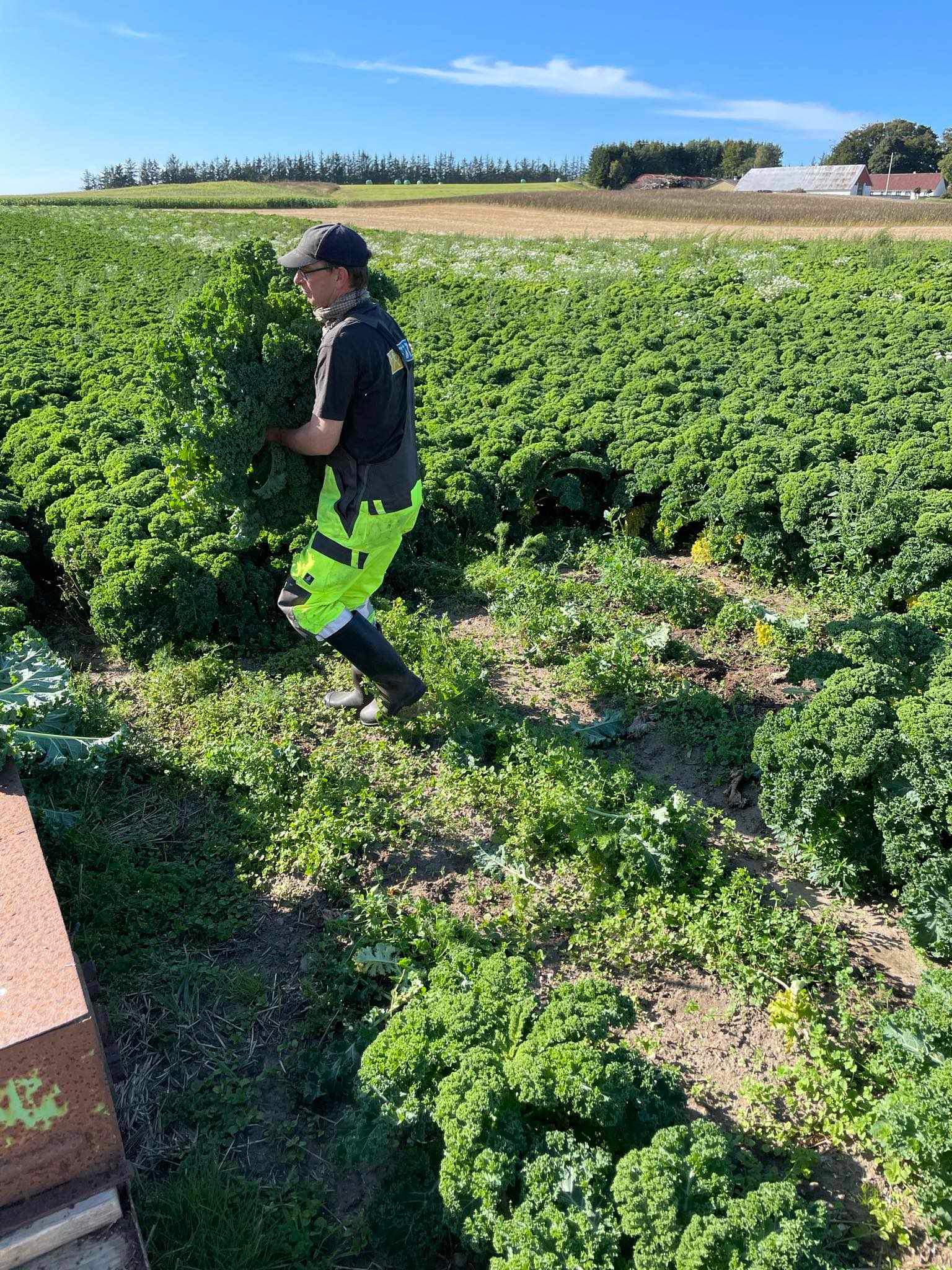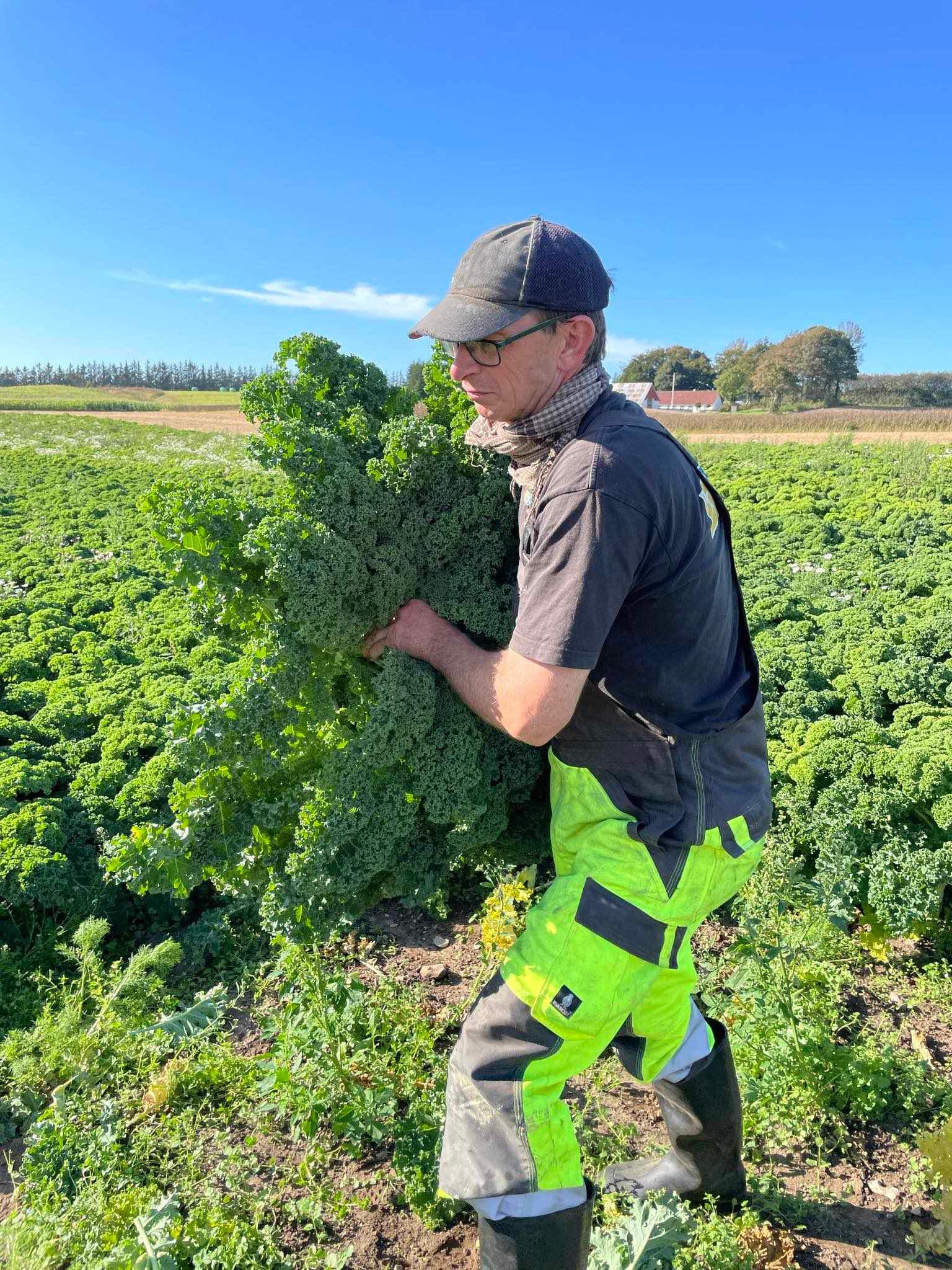 De ribbede og skyllede grønkål sælges også til private kunder og bemærk lige den smukke gamle Bukh traktor som transporterer kålen hjem til gården – en ældre sag fra 1961. Flot og nyrenoveret – blev som en overraskelse brugt til at transportere Ole og fru Anja fra kirke til forsamlingshuset, da de i 2023 blev gift.