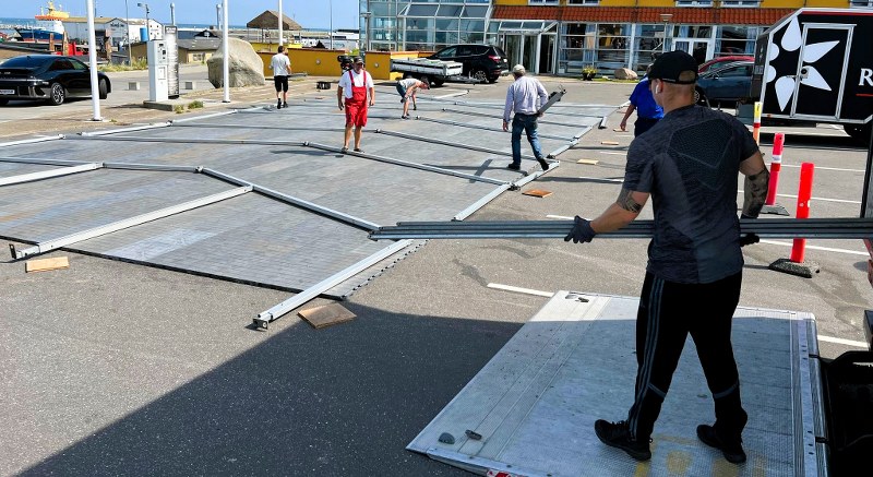 Tidligere har vi rost bygherren for hurtig rejsning af den nye bygning til Rema 1000, men når vi nu kalder det en hård rejsning af teltet hos Marineforeningen, så skyldes det naturligvis, at det er anderledes krævende fysisk arbejde, der lægges for dagen på parkeringspladsen foran Hirtshals Kro og Restaurant.