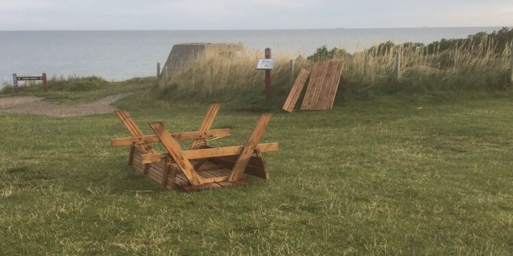 To af de nye bænkesæt, som Støtteforeningen i foråret donerede til Hirtshals Fyr, var i nattens løb blevet smadret, mens resten var blevet vendt på hovedet. Som om en meget lokal tornado havde været forbi. Der ud over var der efterladt et kadaver, sandsynligvis fra stranden ved hegnet.
