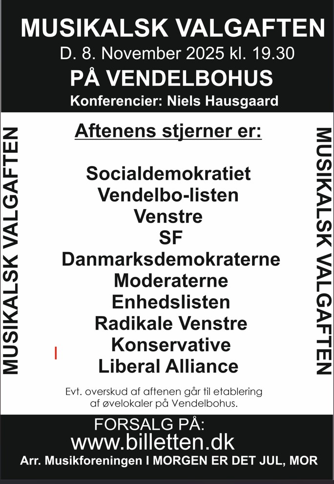 Et eventuelt overskud fra aftenen går til at etablere øvelokaler på Vendelbohus.