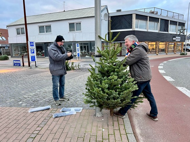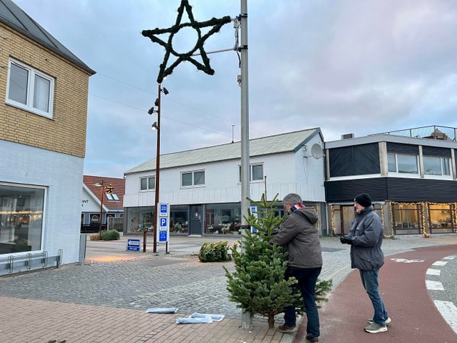 Handelschef Per Martensen fra HHE var lørdag morgen tidligt oppe og i gang på gader og stræder i Hirtshals. Sammen med Henning Hatt Jensen fra Lions var handelschefen i gang med blandt andet at få de sidste juletræer på plads i Runddelen.