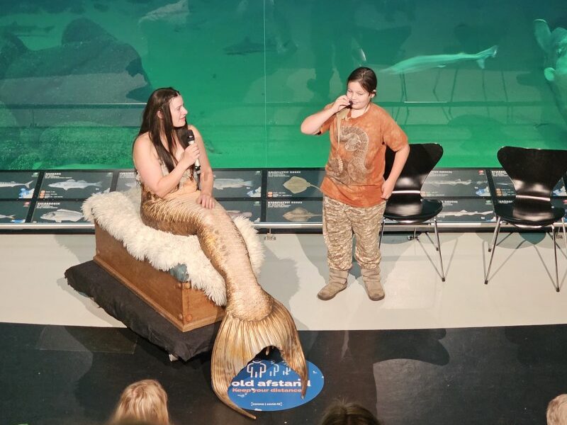 Til sidst var der Meet & Greet med Modig og Havfruen foran Oceanariet, før havfruen hoppede i vandet og udførte sit elegante show blandt de mange stimefisk, hajer og klumpfisk – til stor begejstring for de mange børn.