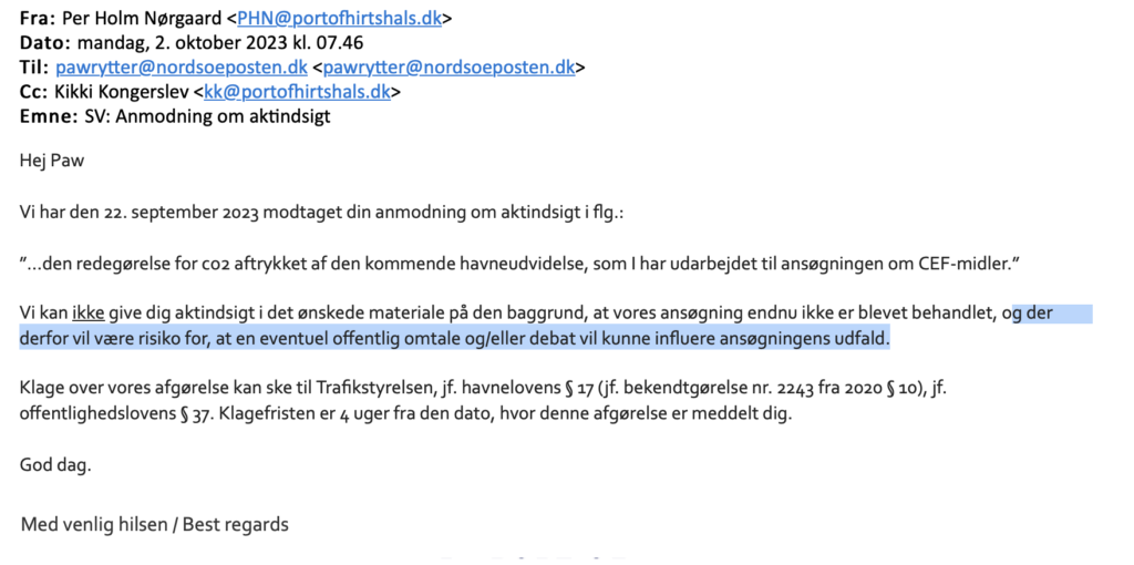 NordsøPosten har ansøgt om aktindsigt i Hirtshals Havns redegørelse for co2 aftrykket af den kommende havneudvidelse, da vi mener, offentligheden har interesse i at have kendskab til den belastning, som store infrastrukturprojekter har på klimaet. Men til vores overraskelse har Hirtshals Havn nægtet aktindsigt med den begrundelse, at “eventuel offentlig omtale og/eller debat vil kunne influere ansøgningens udfald.”