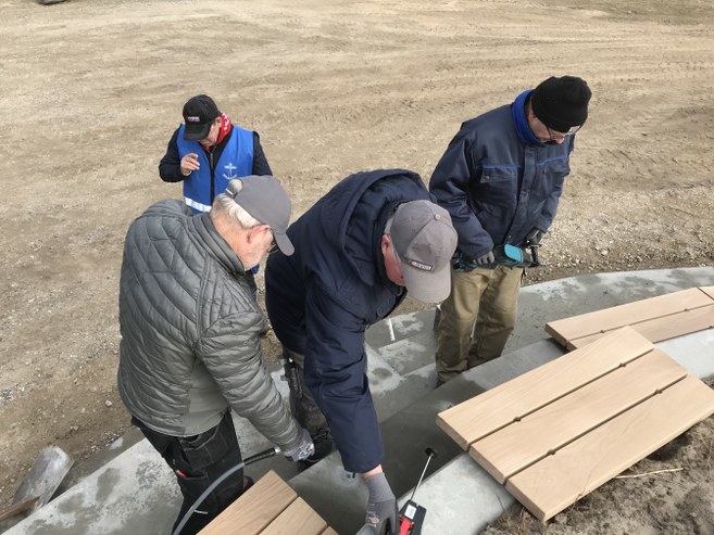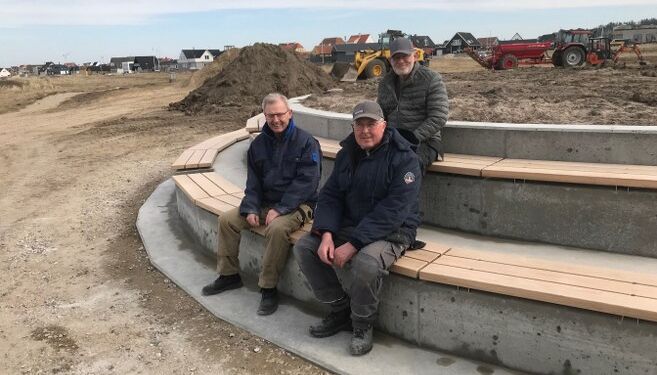 Byforums Fortovsmatroser har netop på sædvanlig professionel vis monteret siddepladserne og Sejlstrup Entreprenørforretning A/S, der for tiden anlægger Udsigtsstien fra Solnedgangspladsen til Hirtshals Fyr, har samtidig grov planeret terrænet på installationens bagside mod byen.