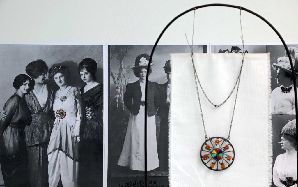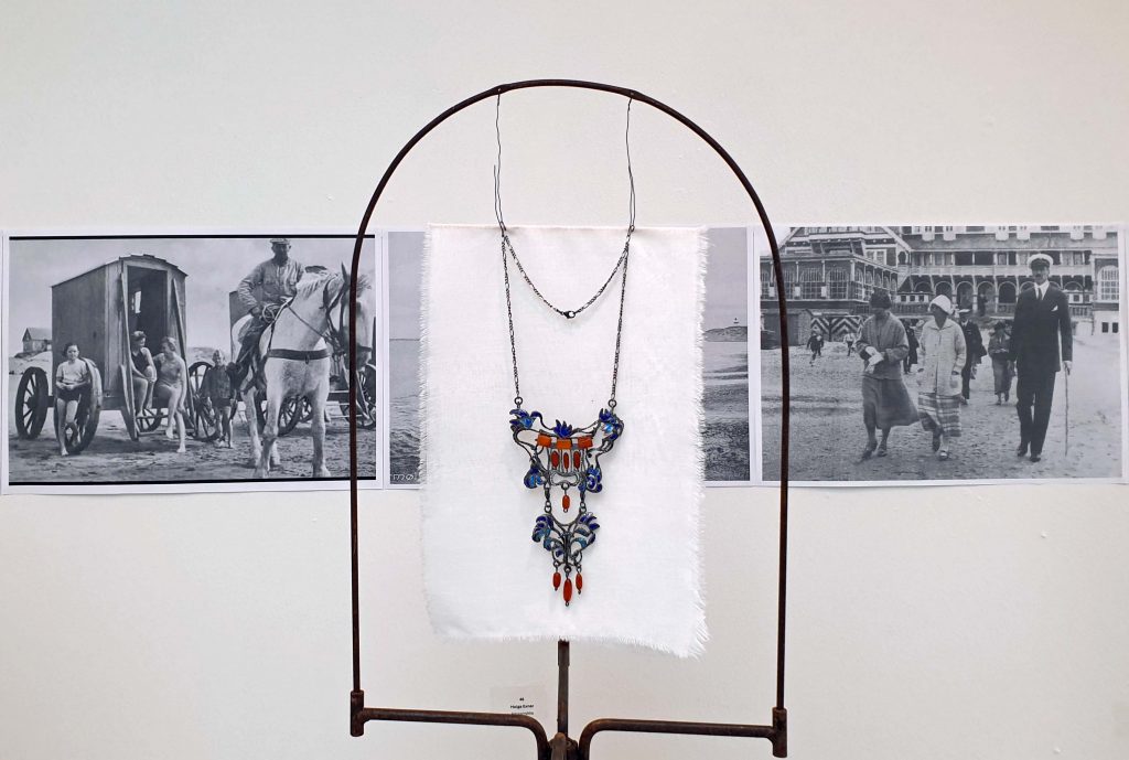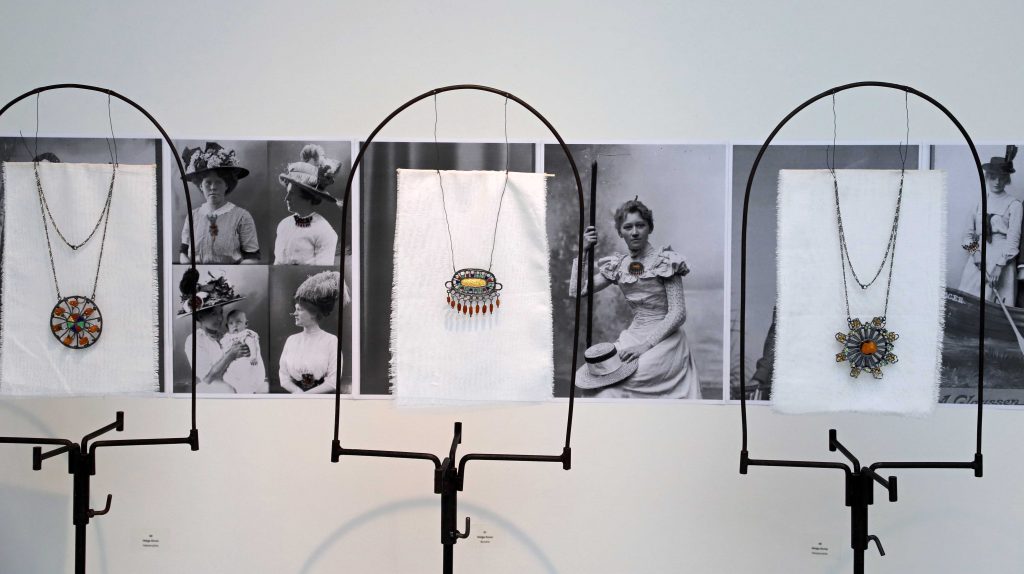 Men da hun dukkede op i ravbutikken blev hun begejstret. Og nu indgår de gamle perler i en ny serie smykker, som i Vrå Udstillingen 2025 er udstillet foran fotografier af smukke kvinder i datidens mondæne Skagen.