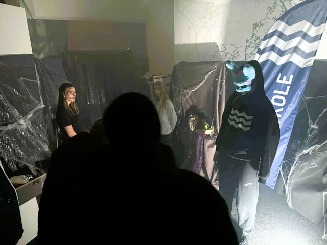 Allerede fra kl. 17 kunne de modige besøge det hjemsøgte hus på Jepsen Plads, hvor mørke skygger og uventede gys satte gang i Halloween-stemningen godt hjulpet på vej af elever fra Nordsøen Fri Fagskole. Nogenlunde samtidig fyldte Hirtshals Skoles Trivselskor luften med uhyggelige Halloweensange, der både fik nakkehårene til at rejse sig og smilene frem hos de fremmødte.