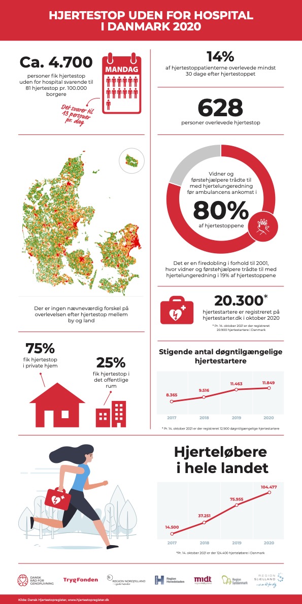 – Det er utrolig glædeligt, at der bliver ydet livreddende førstehjælp, inden ambulancen ankommer, ved fire ud af fem hjertestop. Livreddende førstehjælp øger chancen for overlevelse, og derfor er det også fantastisk, at vi i dag er over 124.000 frivillige hjerteløbere i hele landet, som har meldt sig til at løbe afsted for at yde hjertelungeredning og hente en hjertestarter, når der er hjertestop i nærheden. Ser vi på overlevelsen i 2020, er der sket et lille fald siden 2019 fra 16 pct. til 14 pct., som dog ligger indenfor statistisk usikkerhed. Den præcise årsag kender vi ikke, men det er nærliggende at tro, at COVID-19 kan spille en rolle, siger Kristian Bundgaard Ringgren.