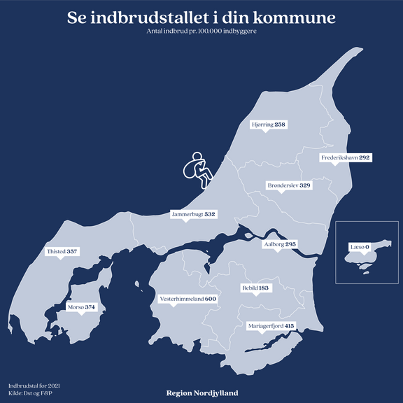 I bunden af statistikken i Region Nordjylland – de kommuner med færrest indbrud pr. 100.000 indbyggere – ligger Rebild med 183, Hjørring med 258 og Frederikshavn med 292 indbrud pr. 100.000 indbyggere.