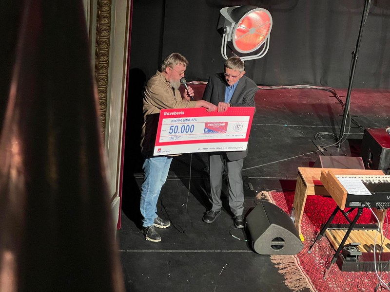 I pausen trådte Søren Jensen i sin egenskab af formand for musikforeningen I morgen er det jul, mor imidlertid op på scenen, hvor han med få velvalgte ord begrundede, hvorfor foreningen havde valgt denne aften at donere en flot check på 50.000 kroner til Hjørring Sommerspil. Den rundhåndede donation blev overrakt til Kaj Nørholm, der lunt takkede på vegne af Hjørring Sommerspil.