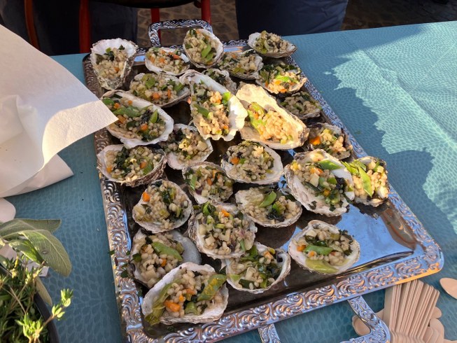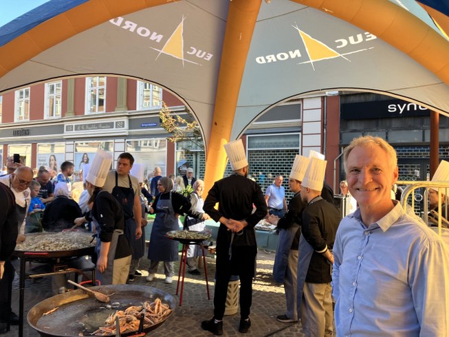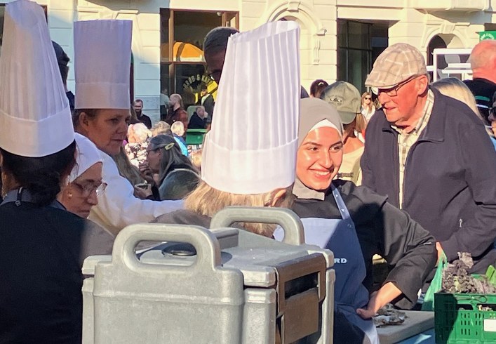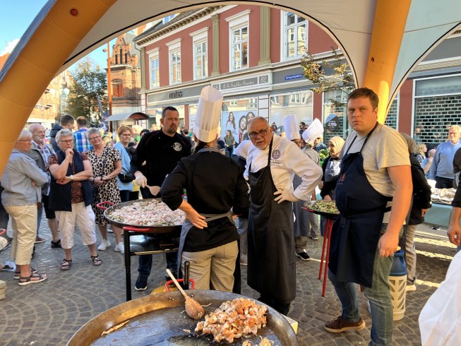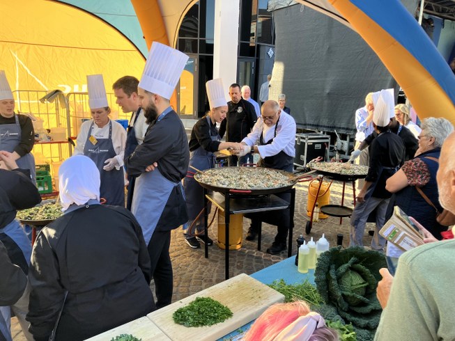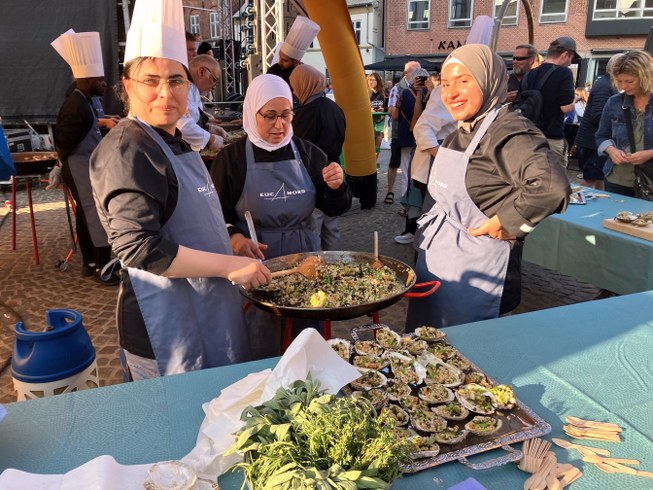 Dygtige elever på EUC Nords Gastronomi & Service linje lavede sammen med restauratør Uffe Nielsen fra Teatercaféen samt Kornets Hus skøn spansk paella med fantastiske, gode, og meget lokale danske råvarer. Lækkerierne blev anrettet og serveret i østersskaller med bæredygtige skeer sponsoreret Skovbo-Ren.
