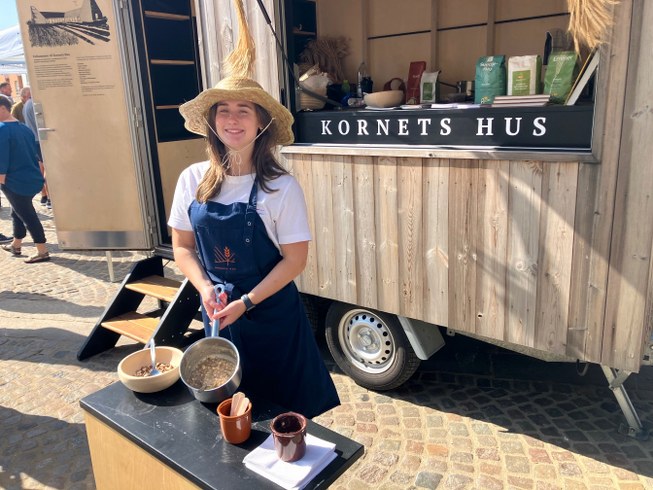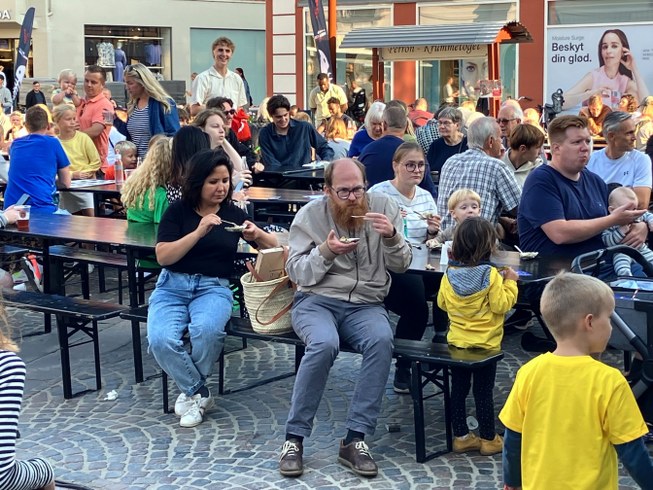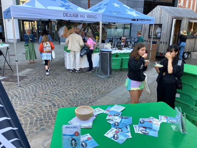 Lørdag var der knap så mange mennesker i midtbyen, og det var en smule tyndt med det annoncerede torvemarked med lokale råvarer. Kornets Hus var der, og det samme var Meny med lækkerier fra Venmark Fisk i Hirtshals.