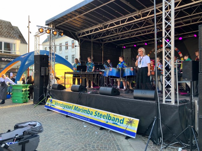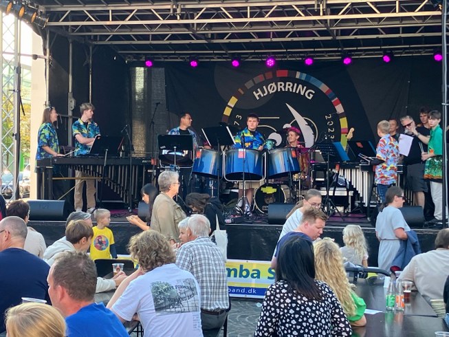 Hjørring Musiske Skole deltog også flot fredag på skolens 50-års fødselsdag. Det blev til flotte koncerter rundt om i midtbyen blandt andet Vendsyssel Marimba Steelband på den store scene.