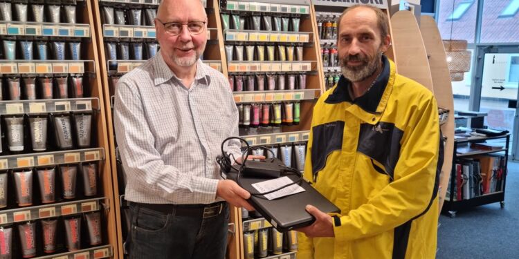 Har du derfor lyst til at hjælpe, er Tommy Høj sikker på, at de kan bruge nogle frivillige. På billedet overrækker Tommy Høj en sponsorereret bærbar computer til Johnny Dalsgaard, som er formand for Natteravnene i Sindal.