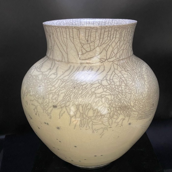 Jens Hostrup har arbejdet med raku siden 1972 og han mestrer den gamle japanske teknik på et virkelig højt niveau. Jens er fascineret af det enkle formsprog og arbejder primært med de klassiske urformer, som han skaber på imponerende vis med farver, der emmer af liv og sanselighed.