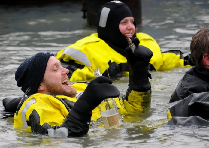 Spring i overlevelsesdragten og slå sammen med andre friske vandhunde katten af tønden i den bette Jollehavn ved Vestmolen ud for Hirtshals Redningsstation.