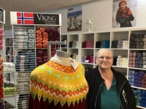 Doris med en af de mange flotte modeller i butikken – strikket naturligvis med garn fra Holmberg Handel.