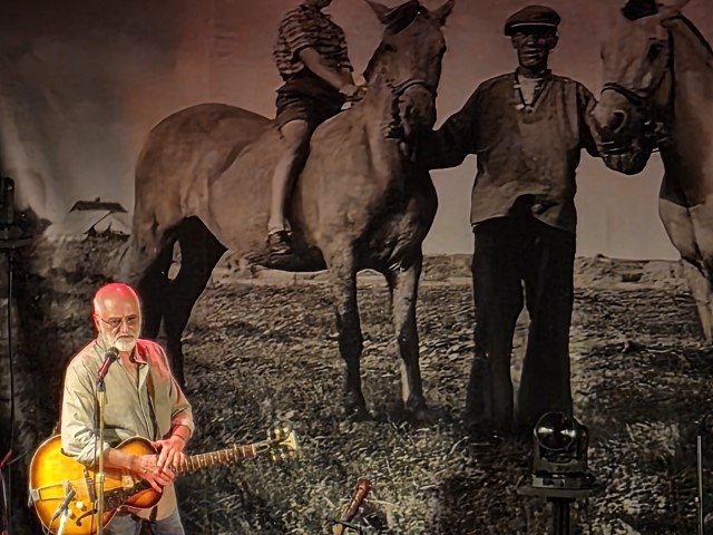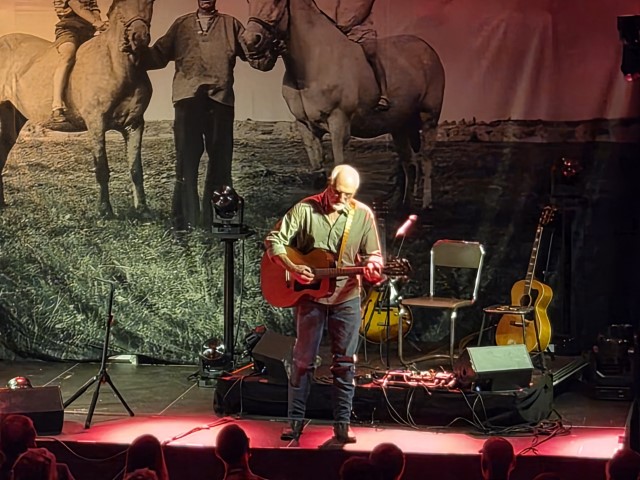 Torsdag aften gæstede han, hans mange guitarer og lysmanden – kvinden Alberte i dette tilfælde – Nordsøen Forskerparks auditorium. Showet begyndte med god jysk humor, mens guitaren lige skulle stemmes en ekstra gang. Bagtæppet på scenen var prydet af et billede af Allan Olsens bedstefar, stående med to heste.