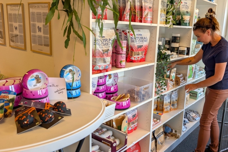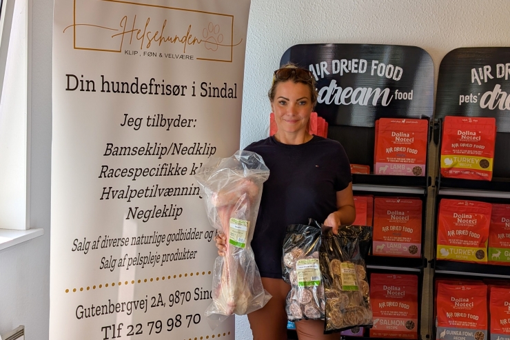 Janni, indehaver af Helsehunden, står her med lidt godbidder, blandt andet et velvoksent kødben på 4,4 kg, og gourmetmad til hunden fra Naturfoder.