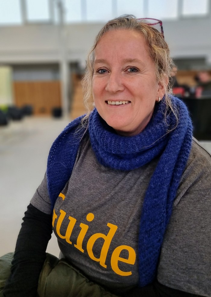 Karrierelæringsvejleder og praktikkoordinator Laila Hingelbjerg Sørensen fra Hjørring Nordvestskoler er guide i dagens anledning og hun hjælper eleverne rundt på EUC Nord, som kan være lidt af en labyrint for gæster. Laila kender eleverne fra deres hverdag og hun kunne se dem gå nysgerrigt rundt i løbet af dagen: