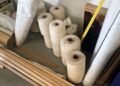 De mange farvespoler i alle tænkelige nuancer af rød, blå, gul, grøn, brun osv. hører også til Jennys arbejdsproces. Hun indfarver nemlig selv den hvide uld og har tusindvis af små prøver samlet i et ringbind, så hun altid kan finde præcis den eller den lysegrønne nuance.