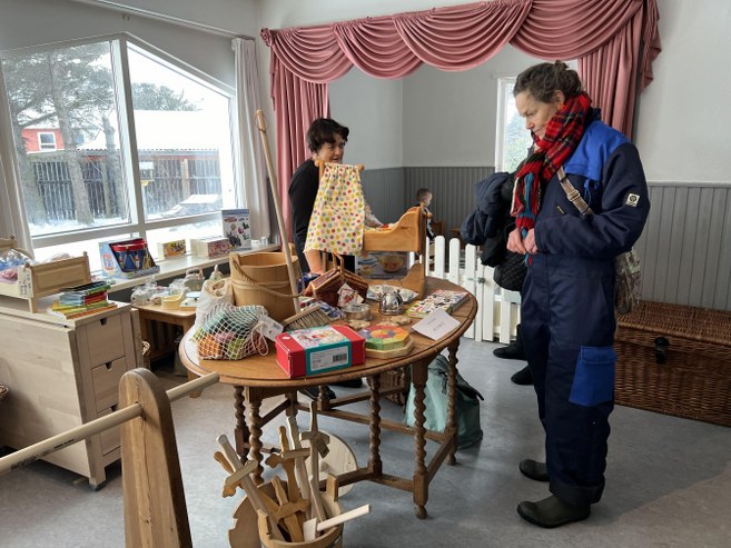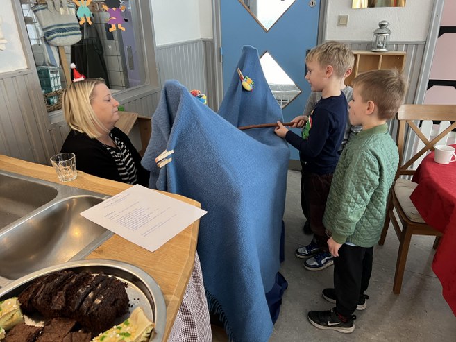 Masser af biler holdt nemlig parkeret langs fortovskanten i begge sider af vejen, hvor et stort skilt viste ind til den planlagte julebasar i den private børnehave med egen vuggestue. Indenfor duftede der af hjemmelavet bagværk, mens store og små hyggede sig gevaldigt ved boder og borde til de glade toner fra spillemanden Peter Krogh.