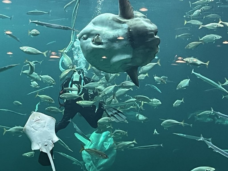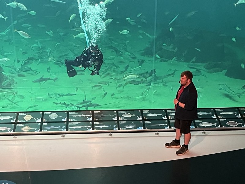 Biolog og udviklingschef Kristina Ydesen var trukket i våddragten og fortalte under fodringen på inspirerende vis om Oceanariets mange forskellige arter.