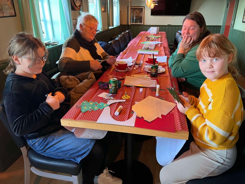 I den gamle Marinestue kan de mindste hygge sig med at lave deres eget julepynt eller julekort. Der er sakse, karton og papir til rådighed.