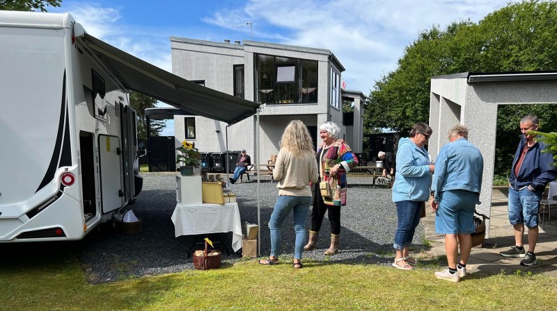Den fine have, hvor træerne bærer tydeligt præg af vestenvinden, byder på masser af hyggelige krinkelkroge med læ og god plads til at arrangere lige præcis den slags kunsthåndværkermarked i det fri, som vi i forvejen kender fra blandt andet Jytte Meier ved Tronsmark Gl. Skole, Galleri & Kunstværksted.