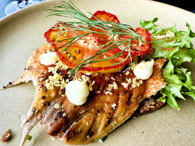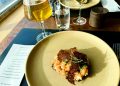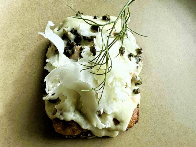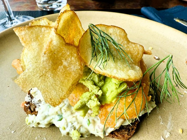 Vi fik laksetatar og rugchips med friskhed og syre, røget makrel med æggeblomme og torsk med karakter i form af med skotsk tartarsauce, anderledes torskerogn med selleripuré og rå blomkål, samt hønsesalat med svampe elegant anrettet og smagfuldt balanceret. Hver bid føltes som en hyldest til havet og det nordiske køkken.