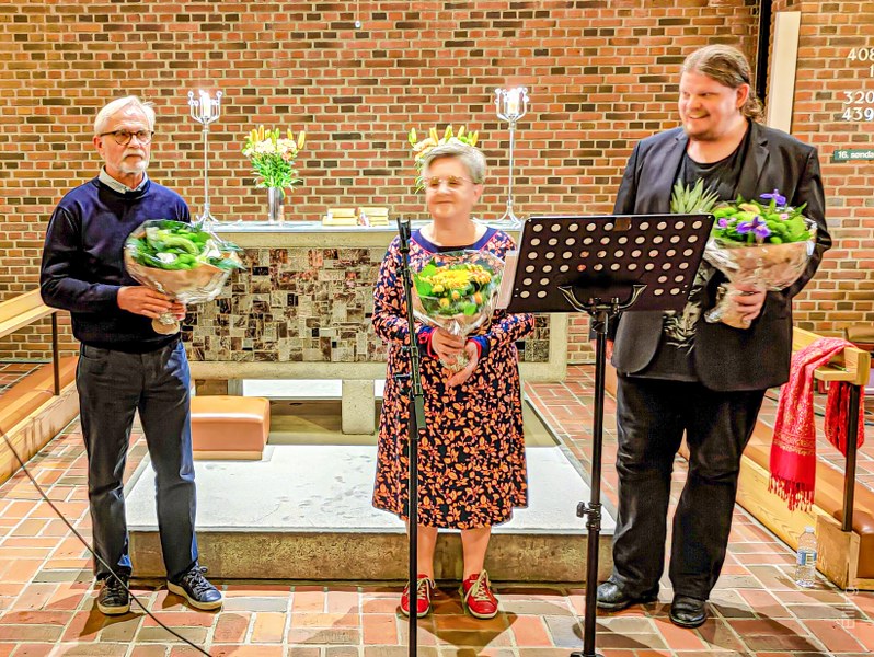 Efter koncerten var der fortjente blomster til fra venstre digter Poul Jansen, kirkesanger Lene Lund og organist Peter Emil Ryom… Sidstnævnte havde sat musik til digtene, og det var en smuk og bevægende aften, hvor ordene fik vinger til melodier, der fornemt matchede det enkelte digts stemning…