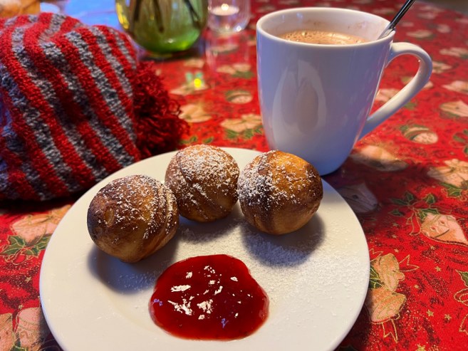 Her var ikke bare betydeligt lunere end udenfor, men også den herligste duft fra køkkenet, mens julemusik strømmede stemningsfuldt fra transistorradioen, hvilket fristede til en portion æbleskiver med varm gløgg, der gav god varme helt ned i tæerne samt kulør til næse og kinder.