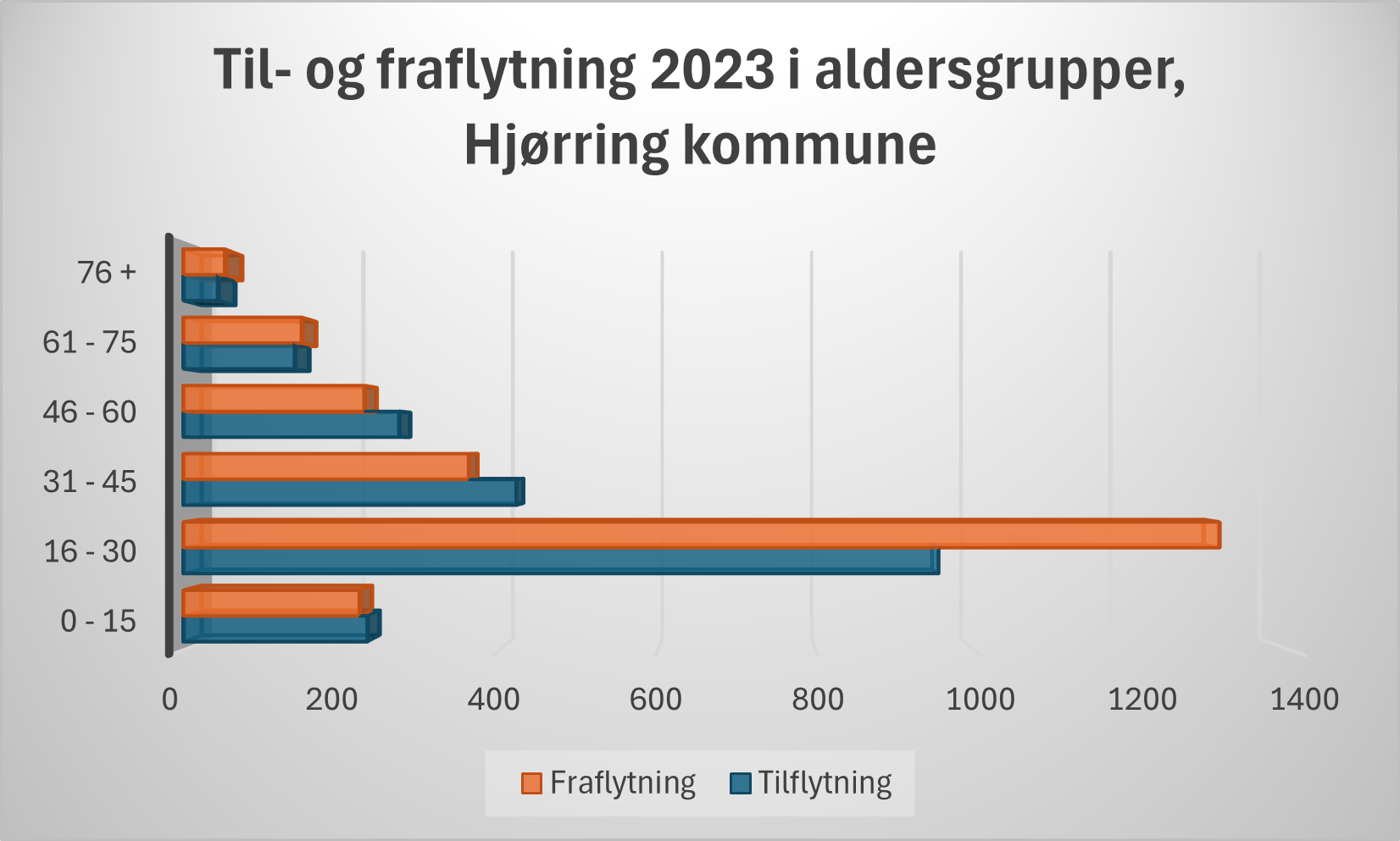 Det er ingen overraskelse, at den største frafraflytning sker i aldersgruppen 15 – 30 år, hvor mange unge rejser ud for at uddanne sig. Her var der i 2023 1310 personer, der flyttede fra kommunen, mens 955 flyttede til Hjørring. Altså et minus på 355.