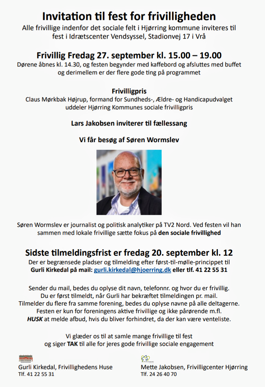 Da der er begrænset antal pladser til festen, er hurtig tilmelding nødvendig. Tilmelding skal ske på mail til [email protected] eller på telefon 41 22 55 31.