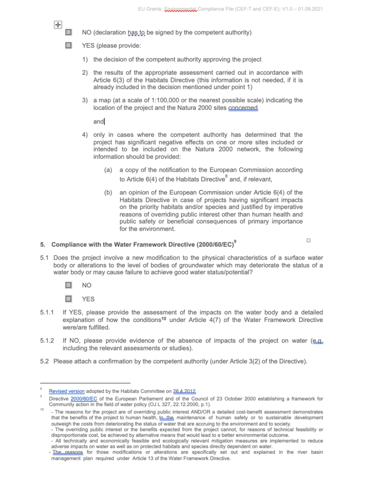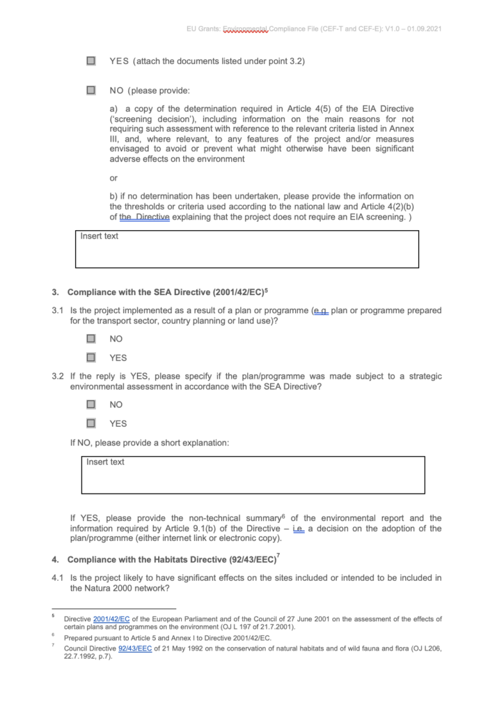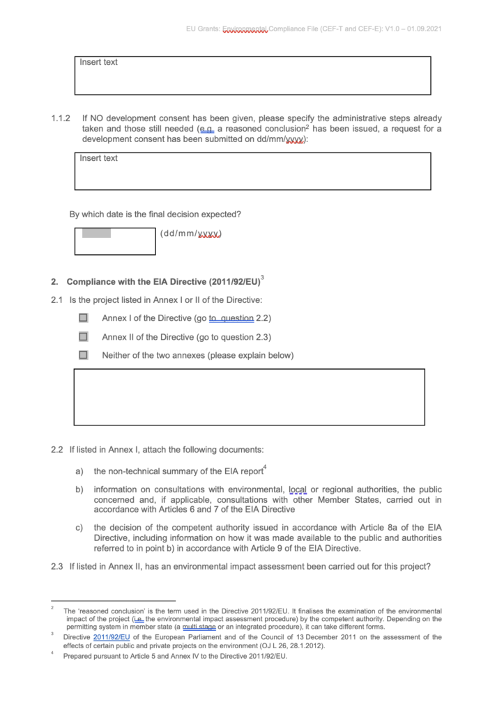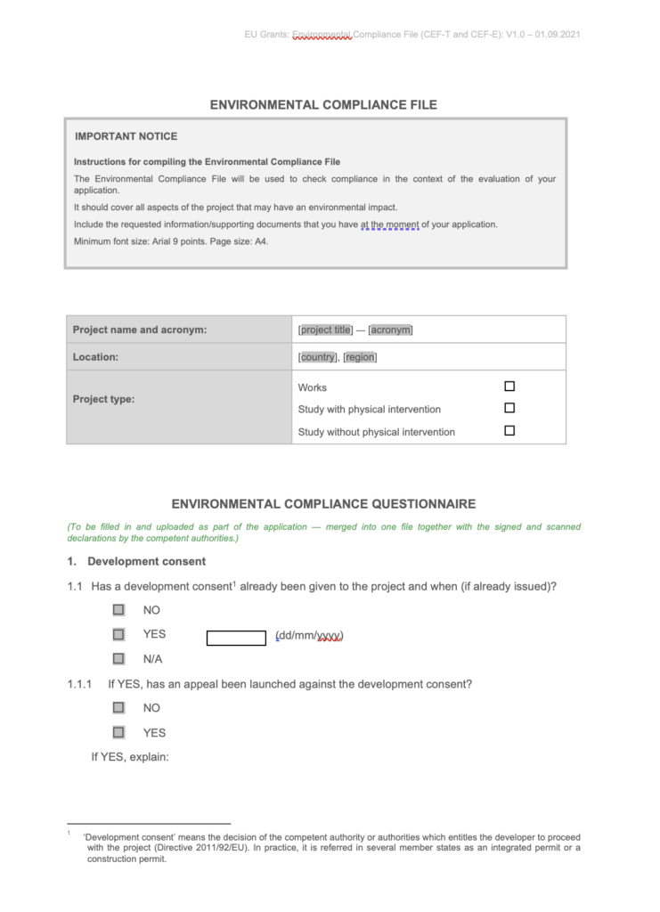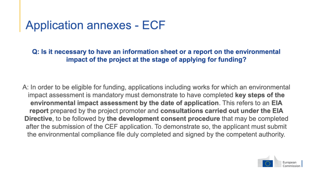 ”For at være berettiget til fondsmidler skal ansøgninger, der omfatter arbejder, for hvilke en miljøkonsekvensvurdering er obligatorisk, dokumentere, at de har gennemført de vigtigste trin i miljøkonsekvensvurderingen på ansøgningsdatoen. Dette refererer til en miljøkonsekvensrapport udarbejdet af projektlederen og konsultationer udført i henhold til miljøkonsekvensdirektivet, som skal efterfølges af udviklingstilladelsesproceduren, der kan afsluttes efter indsendelse af CEF-ansøgningen. For at dokumentere dette skal ansøgeren indsende miljøoverensstemmelsesrapport (the environmental compliance file), der er udfyldt og underskrevet af den kompetente myndighed.”