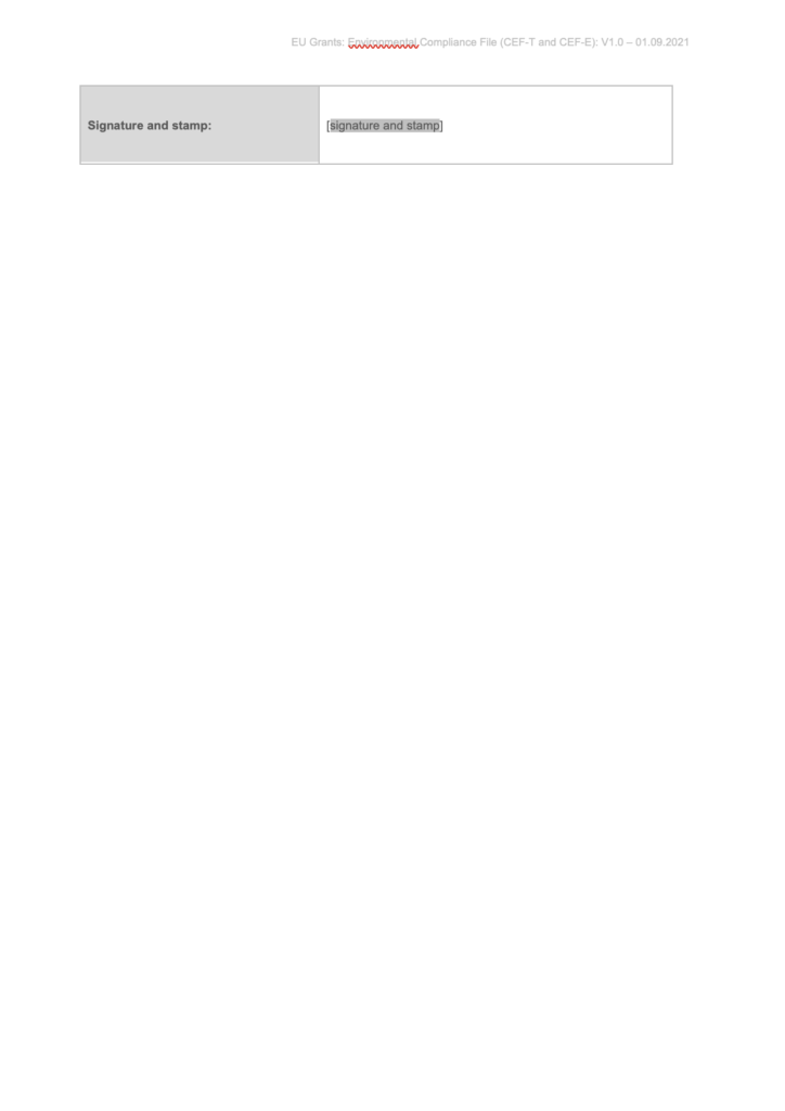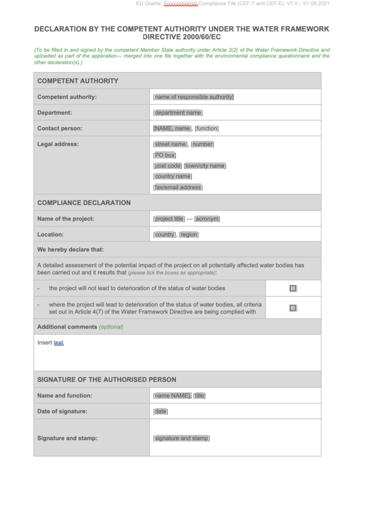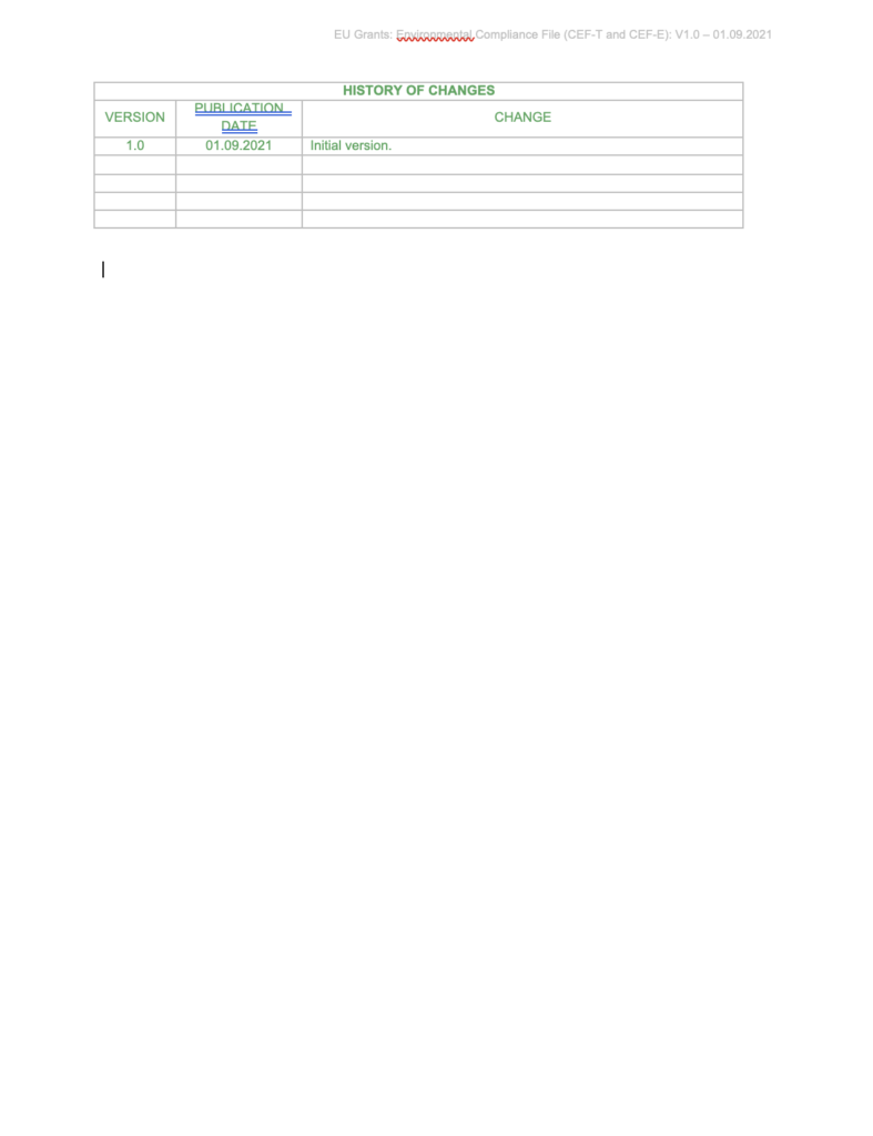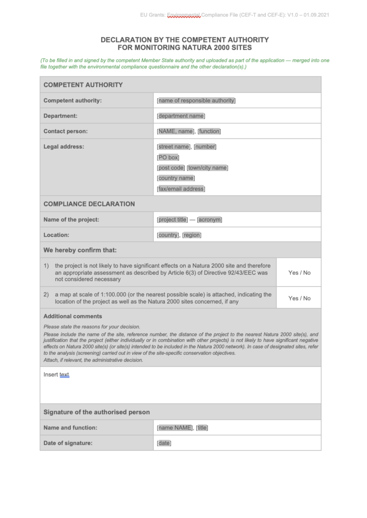 ”For at være berettiget til fondsmidler skal ansøgninger, der omfatter arbejder, for hvilke en miljøkonsekvensvurdering er obligatorisk, dokumentere, at de har gennemført de vigtigste trin i miljøkonsekvensvurderingen på ansøgningsdatoen. Dette refererer til en miljøkonsekvensrapport udarbejdet af projektlederen og konsultationer udført i henhold til miljøkonsekvensdirektivet, som skal efterfølges af udviklingstilladelsesproceduren, der kan afsluttes efter indsendelse af CEF-ansøgningen. For at dokumentere dette skal ansøgeren indsende miljøoverensstemmelsesrapport (the environmental compliance file), der er udfyldt og underskrevet af den kompetente myndighed.”