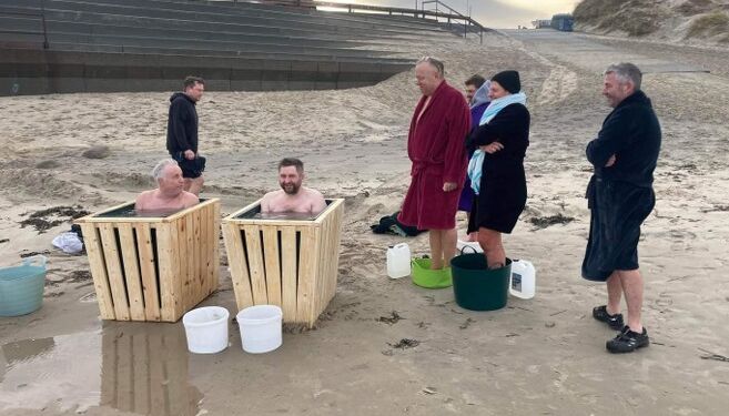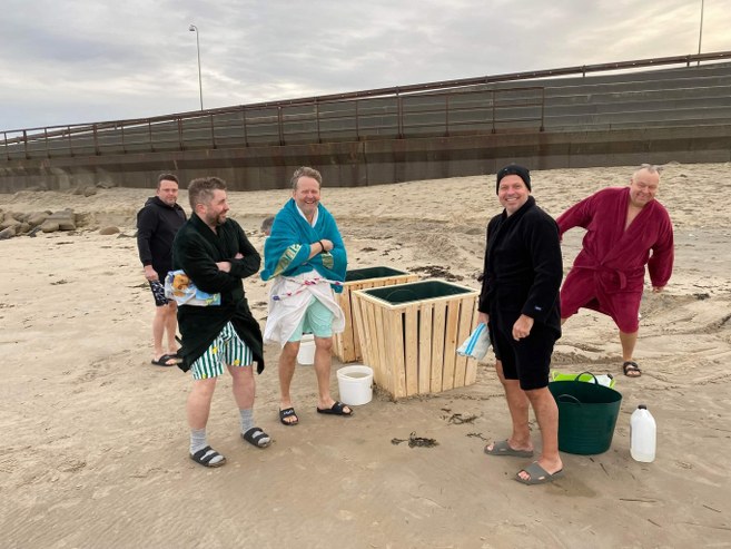Hvordan det var lykkedes for Mads Halle Bruun fra Surf og Natur at lokke en flok lokale fra “Hirtshals hopper på vægten” med til at være frivillige forsøgspersoner, melder historien ikke noget om, men en bjesk har måske fået det hele til at glide lidt mere gelinde i kulden på Husmoderstranden.