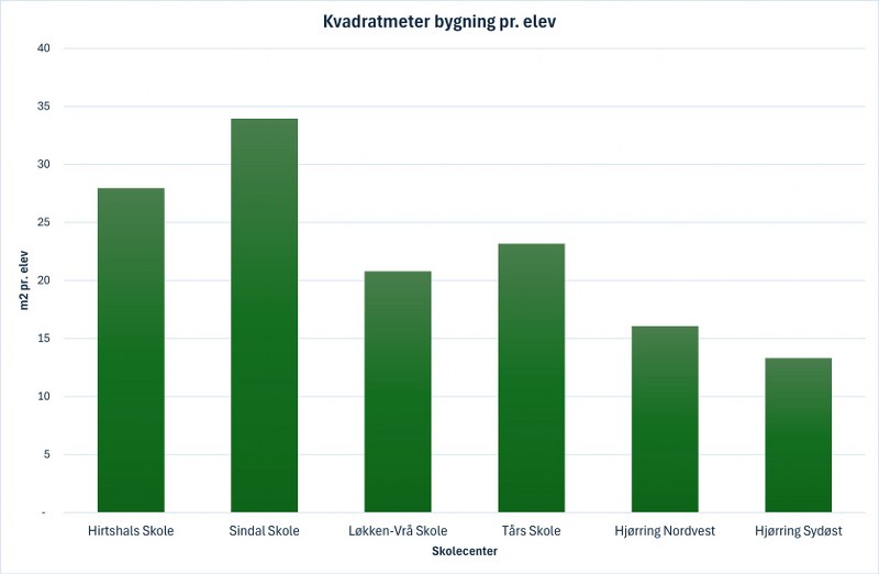 Som det fremgår af figuren, er der meget stor forskel på hvor mange kvadratmeter hvert skolecenter har pr. elev. Sindal skolecenter har 34 m2 pr. elev, mens Hjørring Sydøstskole med 13m2 kun har 38% af det areal. Den forskel giver meget forskellige muligheder for at elever kan finde ro og plads til gruppearbejde.
